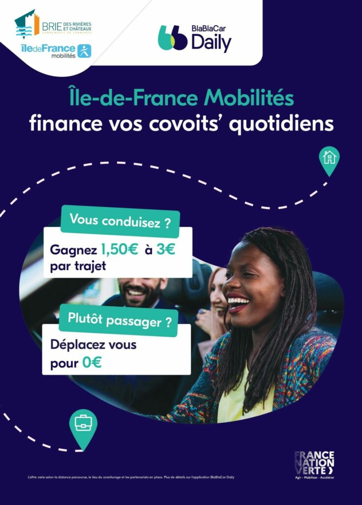 Depuis septembre 2024, la Communauté de Communes Brie des Rivières et Châteaux encourage les automobilistes du territoire à partager leurs trajets du quotidien grâce l’application BlaBlaCar Daily. En partenariat avec Île-de-France Mobilités, les conducteurs recevront au minimum 2 € à chaque covoiturage et le trajet est gratuit pour les passagers.
