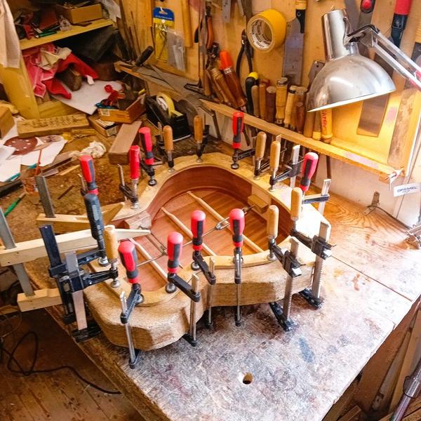 Dans son atelier à Valence-en-Brie, il se consacre pleinement à la fabrication d’instruments de musique.
