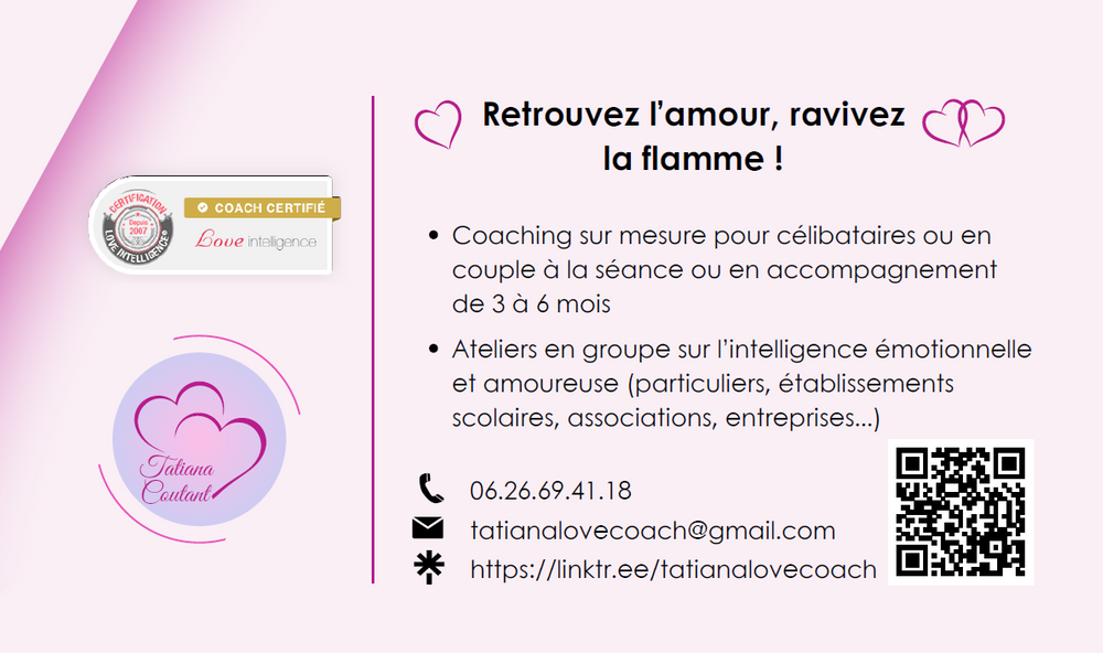 Tatiana accompagne les personnes célibataires à (re)trouver l’amour et les personnes en couple qui traversent une période difficile à raviver la flamme.