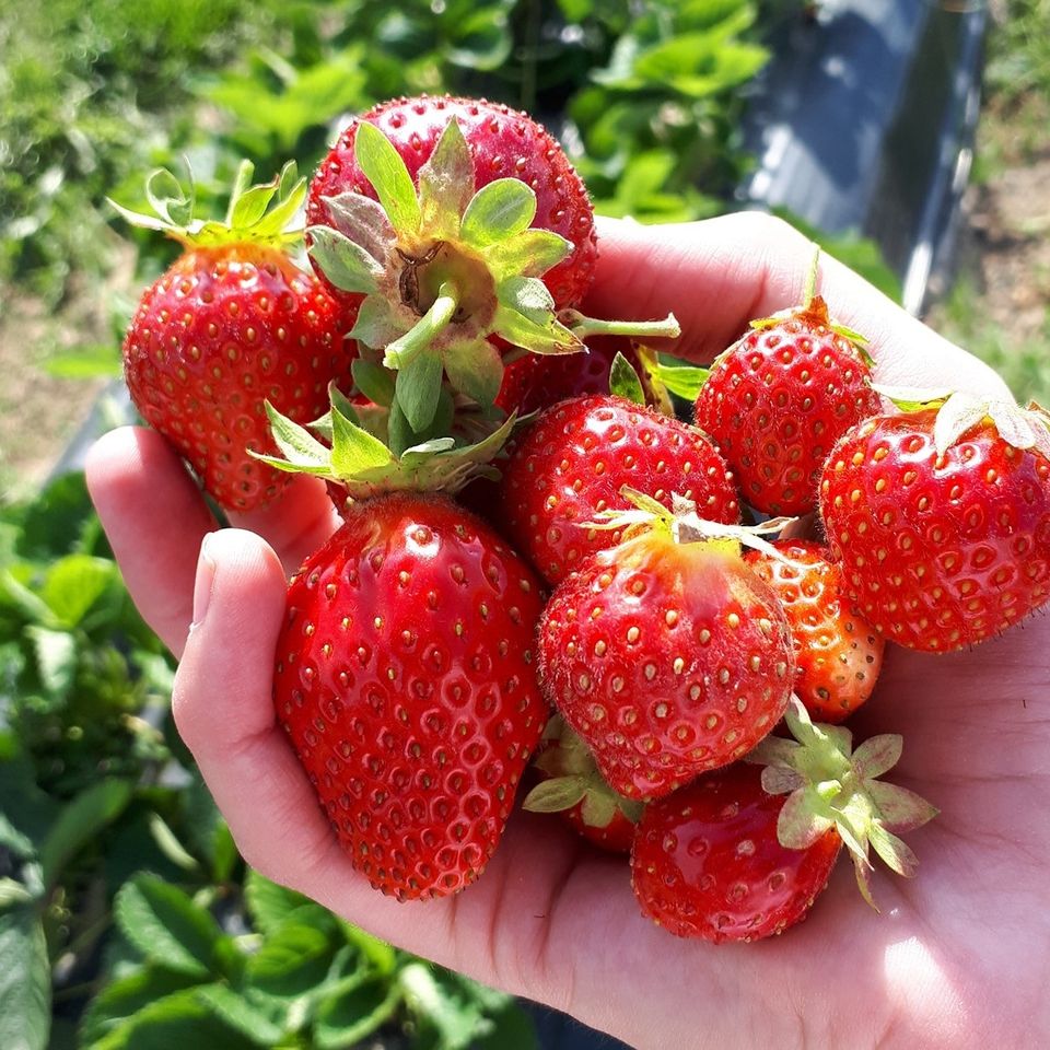 Productions de la ferme : Fraises en libre cueillette, framboises, rhubarbe, haricots verts mais également une serre de maraîchage depuis 2022 ! Vous y trouverez des légumes à ratatouille : tomates, courgettes, poivrons, aubergines.