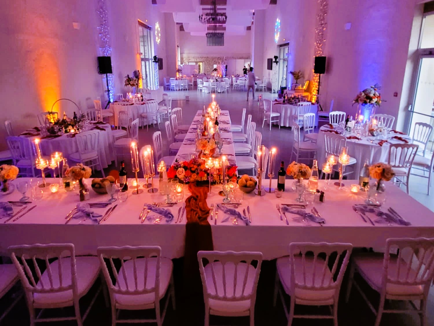 Avec une superficie de 300 m², la salle compte sur un espace dégagé et un plafond de 8 mètres sublimé par de beaux lustres en fer forgé. À l’intérieur, vous trouverez une estrade de 35 m². L’éclairage est personnalisable selon vos souhaits.