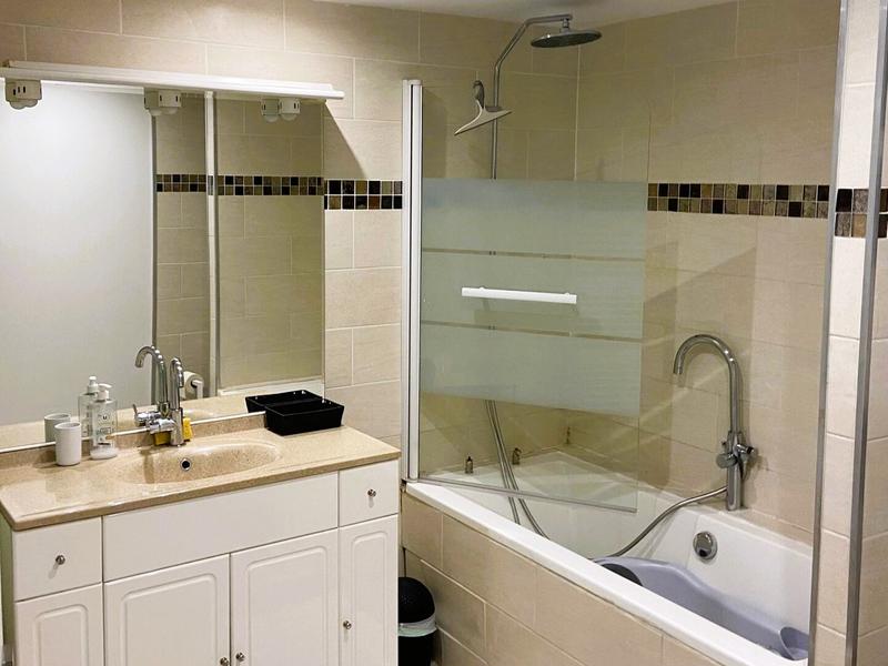 – 1 salle de bains avec baignoire, WC, lavabo,