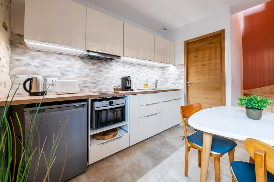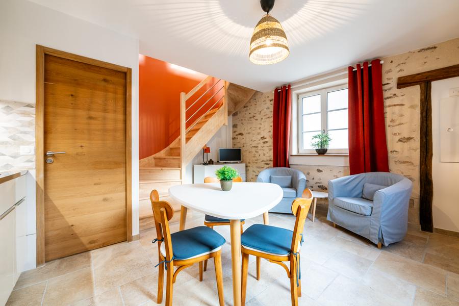 Cet hébergement touristique séduit par ses pierres apparentes et ses volumes généreux, agrémentés d’équipements contemporains : chauffage au sol pour un confort optimal toute l’année, connexion fibre haut débit parfaite pour le télétravail, et cuisine tout équipée.