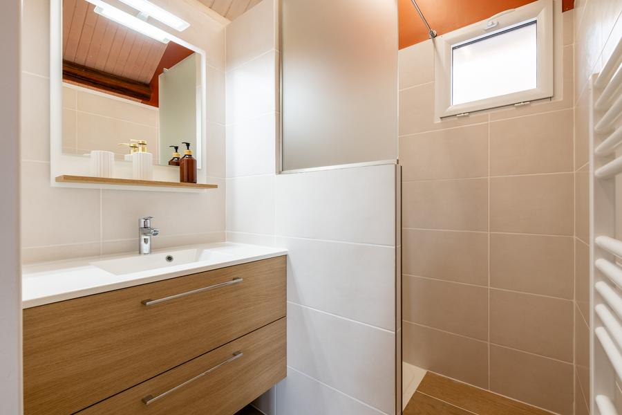 À l’étage, une chambre cosy pour 3 personnes avec lit double 160 cm et fauteuil convertible (90 × 180 cm), idéal pour enfant ou voyageur supplémentaire. Salle de bain moderne avec grande douche.