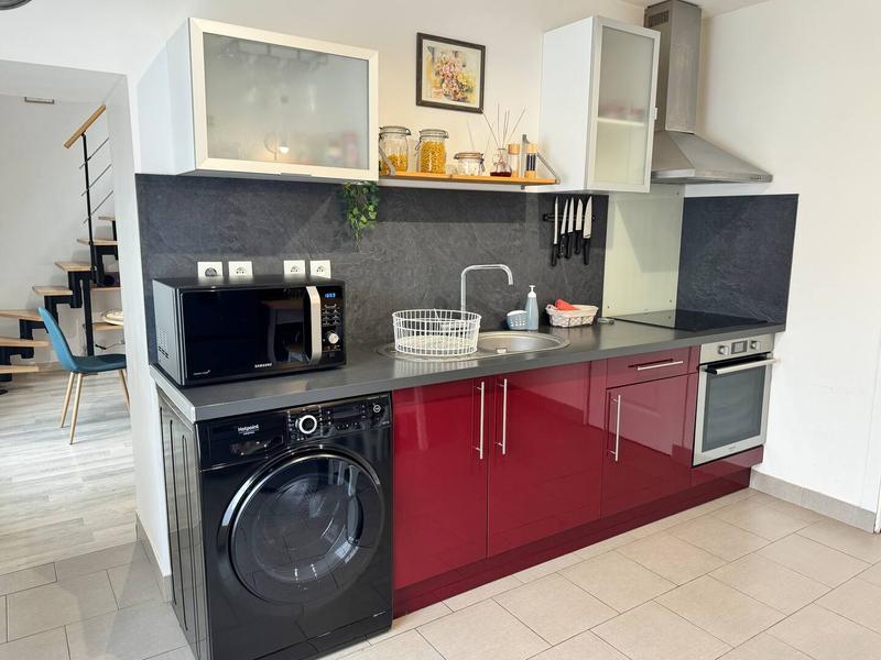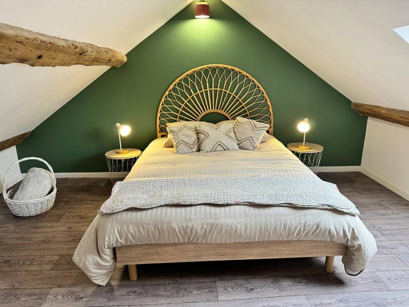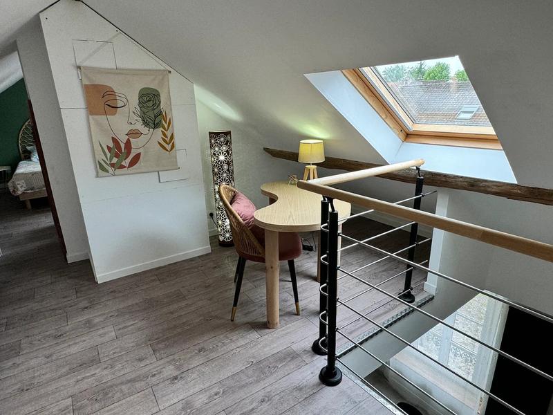– À l’étage vous disposez d’un espace de travail sur la mezzanine avec connexion Wi-Fi, un dressing et une chambre mansardée.