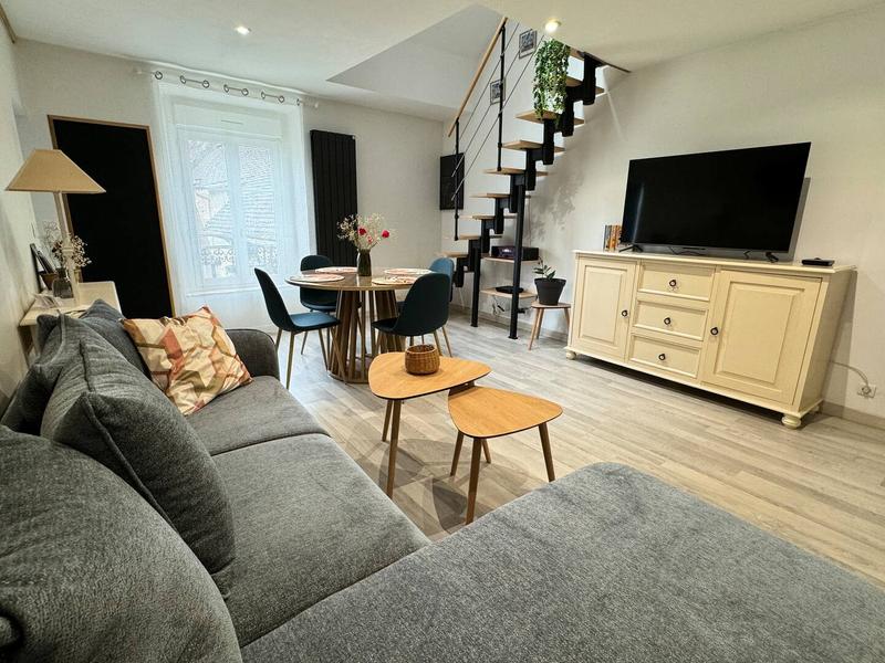 – Salon confortable avec canapé d’angle convertible pour deux couchages supplémentaires , Smart Tv Qled 50 pouces et grande table pour les repas.