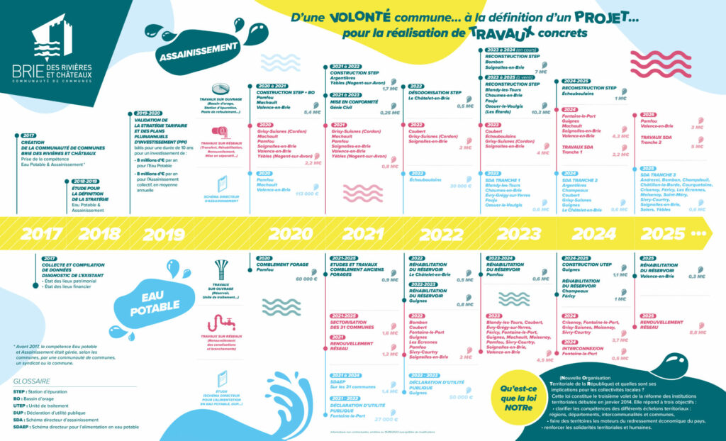 Dès 2017, la Communauté de Communes Brie des Rivières et Châteaux a fait le choix de prendre les compétences Eau Potable et Assainissement du territoire pour assurer la continuité des services et des projets engagés par les différentes collectivités (Communes, Syndicats, Communautés de Communes) et permettre à toutes les communes de bénéficier d’un même niveau de service public.