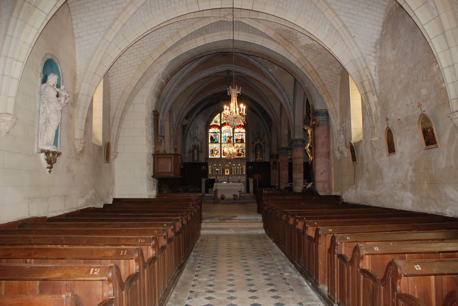 – La nef comporte 4 travées de voûtes à croisées d’ogives, lesquelles cachent une charpente médiévale pouvant dater du 15e siècle. Cette voûte en briques de plâtre réalisée en 1888 a remplacé l’ancienne voûte romane de 5 travées.