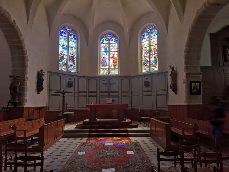 Le chœur, du 15e siècle, comporte des vitraux de 1896, enchâssés dans des baies géminées à rosaces et meneaux.