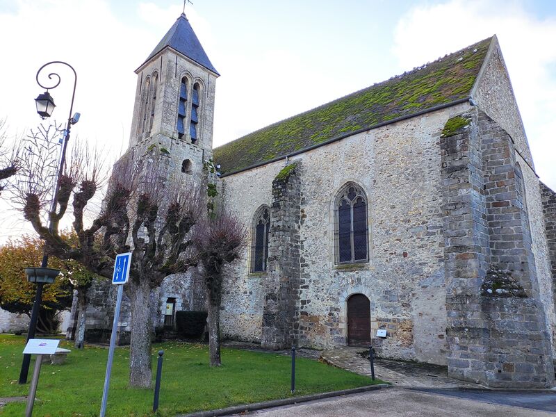 L’Église remonterait au 12e siècle. De cette époque subsistent les parties basses côté du chœur, notamment une colonne octogonale qui sépare la nef du collatéral (le clocher). A-t-elle été ensuite détruite lors des guerres ? Toujours est-il que les Rollet reconstruisent en partie l’édifice aux 15e et 16e siècles. Les fenêtres à meneaux (montants et traverses en pierre divisant l’ouverture) ainsi que les voûtes datent du 15e siècle. Le portail du 16e siècle est orné d’une décoration de vigne.