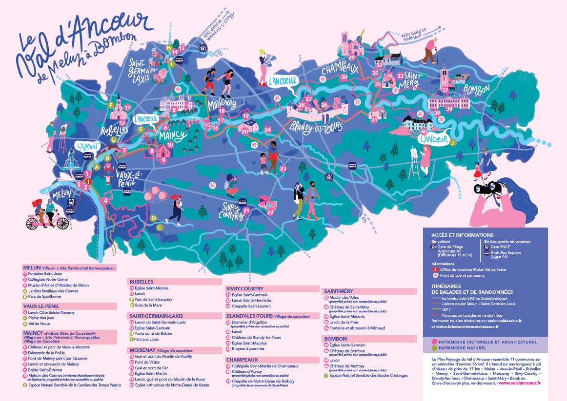Au fil des cours d’eau – l’Almont, l’Ancoeuil (ou Ancueil) puis l’Ancoeur – le Val d’Ancœur égraine ses panoramas : des villages, des forêts, des châteaux (Vaux-le-Vicomte, Blandy-Les-Tours…) mais aussi, à la confluence de la Seine, des espaces urbanisés.